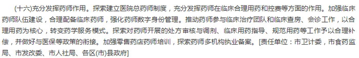 “(十六)充分发挥药师作用。探索建立医院总药师制度,充分发挥药师在临床合理用药和控费等方面的作用。加强临床药师队伍建设,合理配备临床药师,强化药师数字身份管理。推动药师参与临床治疗团队和临床查房、会诊工作,以合理用药为核心,转变药学服务模式。探索对药师开展的处方审核与调剂、临床用药指导、规范用药等工作予以合理补偿,并做好与医保等政策的衔接。加强零售药店药师培训,探索药师多机构执业备案”。