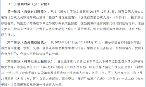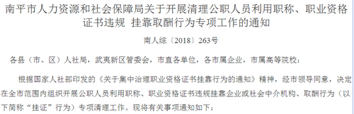 2018年11月27日,南平市人力资源与社会保障局发布了《关于开展清理公职人员利用职称、职业资格证书违规取酬行为专项工作的通知》(以下简称为《通知》),该通知的主旨是:将在福建省南平市市范围内组织开展公职人员利用职称、职业资格证书违规企业或社会中介机构、取酬行为(以下简称“挂证”行为)专项清理工作。