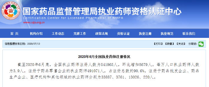 截至2020年6月底,全国执业药师注册人数为541965人,环比增加8679人。每万人口执业药师人数为3.9人。注册于药品零售企业的执业药师491071人,占注册总数的90.6%。注册于药品批发企业、药品生产企业、医疗机构和其他领域的执业药师分别为33887、3761、13026、220人。