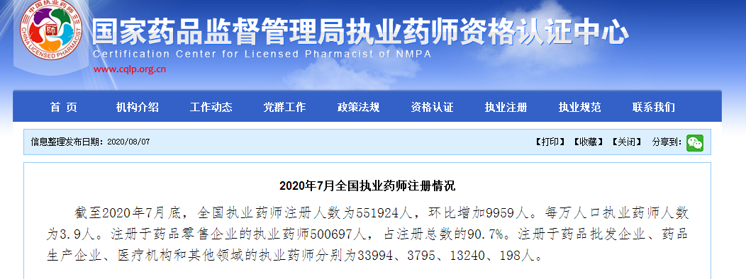 国家药品监督管理局执业药师资格认证中心发布《2020年7月全国执业药师注册情况》,确定了2020年7月执业药师注册人数,7月环比增长近1万人!详情如下!