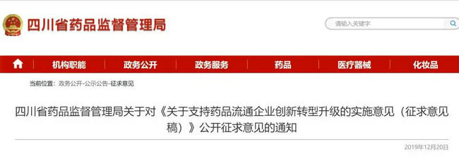 12月20日四川省药监局发布了《关于支持药品流通企业创新转型升级的实施意见(征求意见稿)》(以下简称《实施意见》)。