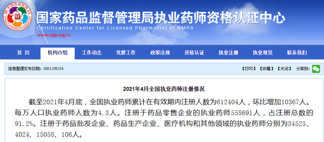 根据国家药品监督管理局执业药师资格认证中心更新数据来看,截止2021年4月底,全国执业药师累计在有效期内注册人数为612404人,环比增加10367人。