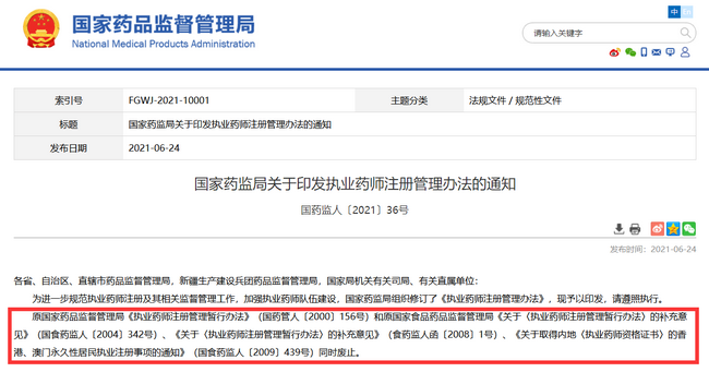 6月24,国家药监局发布通知称,为进一步规范执业药师注册及其相关监督管理工作,加强执业药师队伍建设,国家药监局组织修订了《执业药师注册管理办法》(以下简称《办法》。