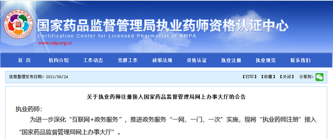 同日,国家药监局执业药师资格认证中心还发布了《关于执业药师注册接入国家药品监督管理局网上办事大厅的公告》(以下简称《公告》)。