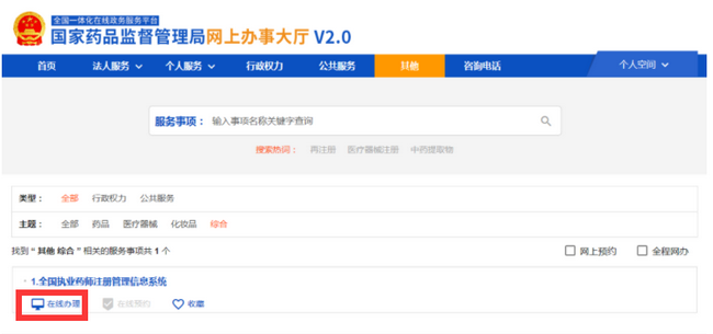 第二步,登录后在标题栏中单击“其他”,“主题”项目中选“综合”,再选择“全国执业药师注册管理信息系统”的“在线办理”。