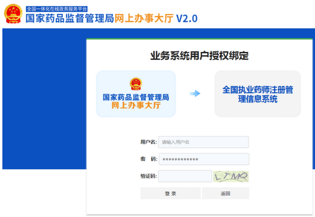 第三步,首次办理执业药师注册用户,进行业务系统用户授权绑定,选择“已有用户的登录授权”。“用户名”输入国家药品监督管理局执业药师注册平台中证件号码(报考执业药师资格考试的身份证件号码),密码默认,输入验证码,登录。