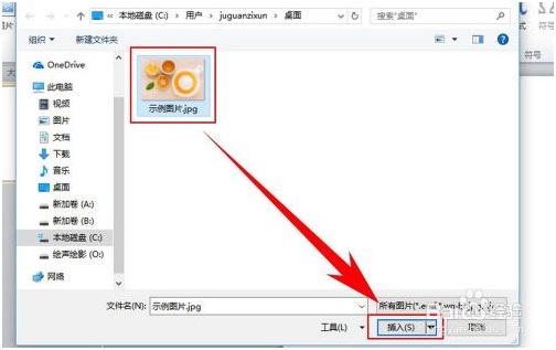 2.这时会弹出一个窗口,在窗口中找到图片的存储路径,选中图片,点击窗口下方的【插入】,将图片插入到PPT里面。