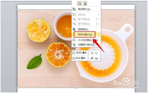 3.图片插入PPT后,选中图片点击鼠标右键,在右键菜单中选择【另存为图片】,如图所示。