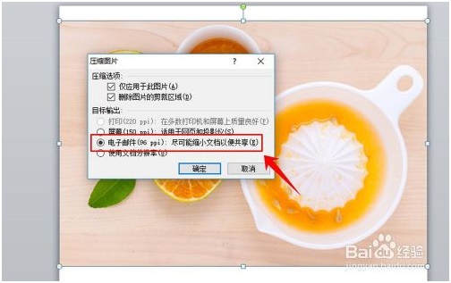 7.这时会弹出一个“压缩图片”的窗口,在窗口中选择【电子邮件】,然后点击窗口下方的【确定】。