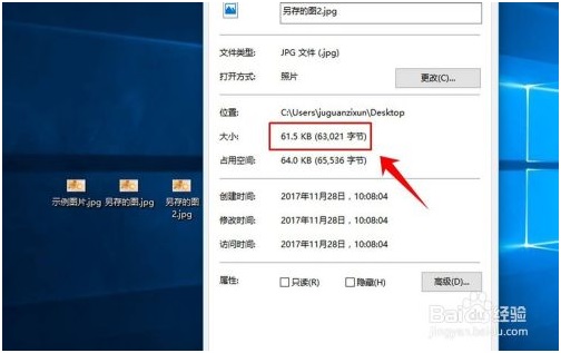 8.再次按步骤5-7的方法查看图片的大小,经查看图片的大小变成了61.5KB,现在图片的大小变成了原图的10%左右,压缩成功。