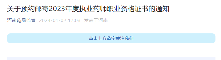 2023年度执业药师职业资格证书开始预约邮寄,请相关人员按照要求预约邮寄本人证书。