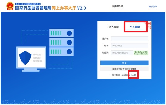 1、登录“国家药品监督管理局执业药师注册平台”单击“网上申报”,进入“国家药品监督管理局网上办事大厅”个人登录页面。或直接登录”国家药品监督管理局网上办事大厅”首页,单击“个人登录”。(注意:“在国家药品监督管理局网上办事大厅”未注册用户请按要求进行“注册”。已注册用户直接登录。)