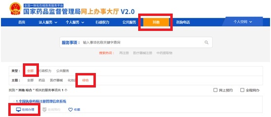2、登录后在标题栏中单击“其他”,在“主题”项目中选“综合”,再选择“全国执业药师注册管理信息系统”的“在线办理”。