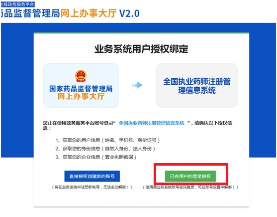 3、首次办理执业药师注册用户,进行业务系统用户授权绑定,选择“已有用户的登录授权”。“用户名”输入国家药品监督管理局执业药师注册平台中证件号码(报考执业药师身份证件号码),密码默认无需输入,输入验证码,登录。验证成功即账号绑定了“全国执业药师注册管理信息系统”,下次选择“全国执业药师注册管理信息系统在线办理”即可直接进入执业药师注册页面,选择注册省份和注册办理模式进行个人注册申报。