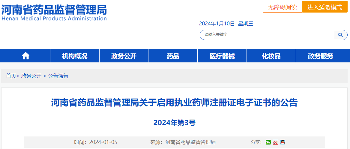 五、2024年1月8日前已颁发且在有效期内的纸质执业药师注册证书仍继续有效使用。如有需要将纸质证书转换为电子证书的申请人可向我局提出转换申请,转换获取的电子证书将同步在河南省药品监督管理局门户网站公示平台上公示。