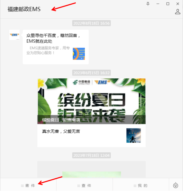 步骤一:关注“福建邮政EMS”微信公众号,选择“寄件”