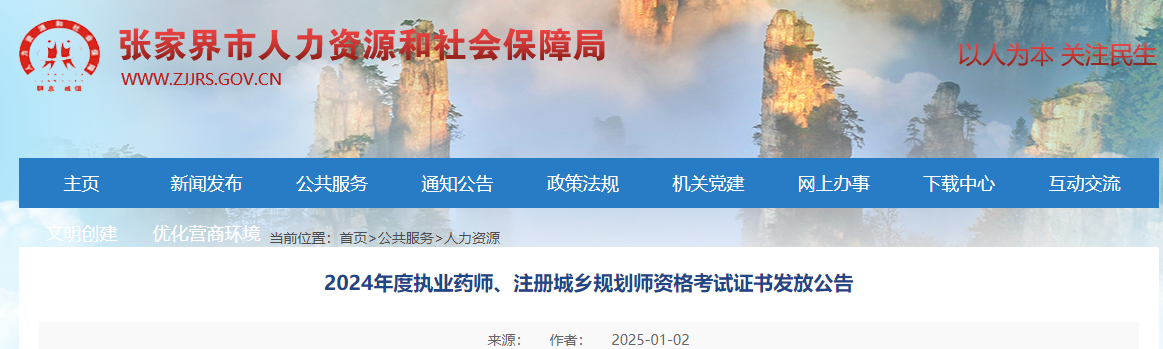 2024年度张家界考区的执业药师、注册城乡规划师资格证书现已开始发放,请附件名单上的考生携带本人身份证原件前往张家界市人事考试中心领取。