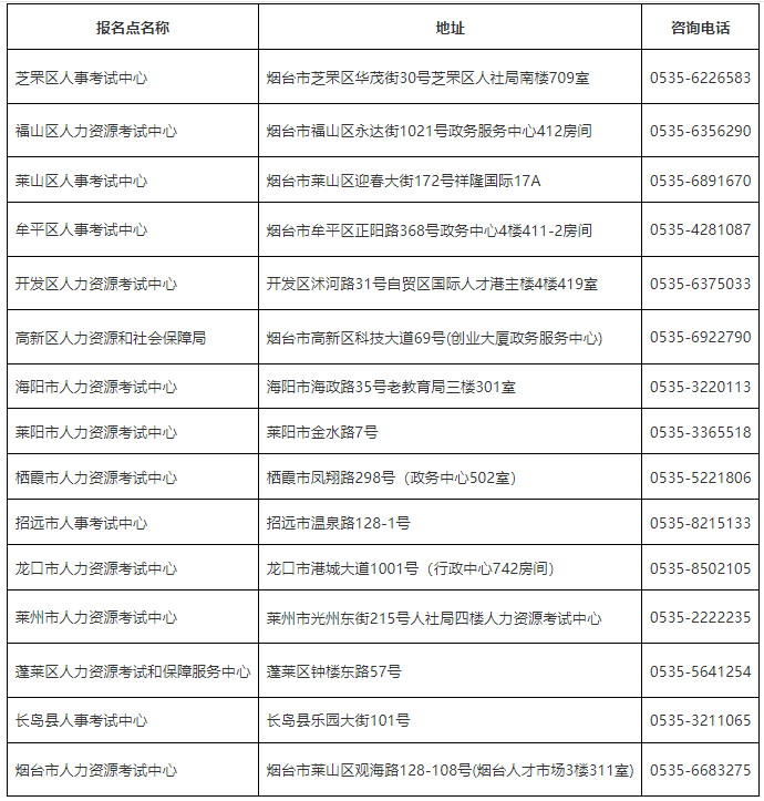 烟台市各县市区考试中心联系电话及地址