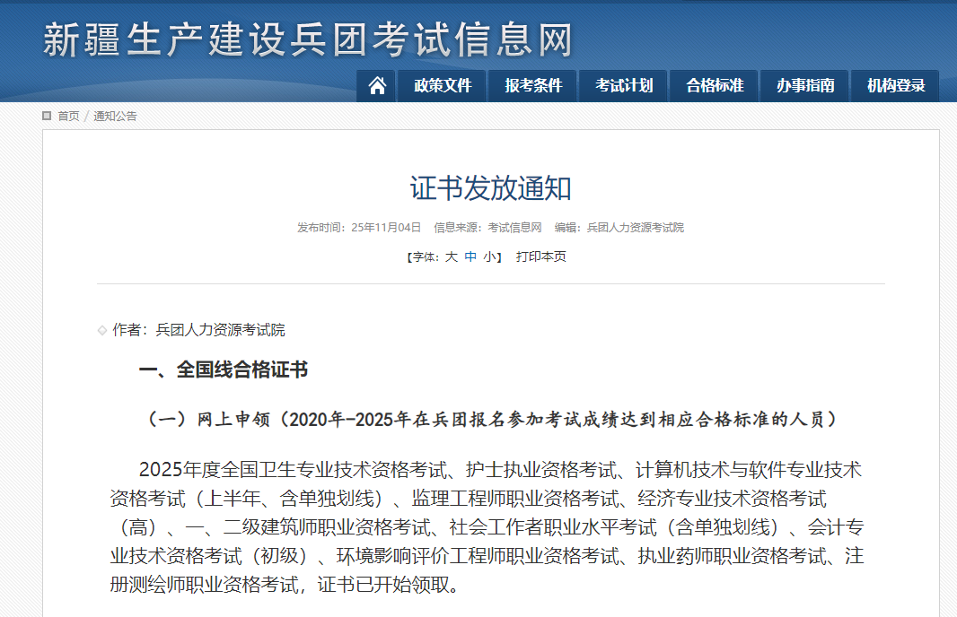 2025年度全国卫生专业技术资格考试、护士执业资格考试、计算机技术与软件专业技术资格考试(上半年、含单独划线)、监理工程师职业资格考试、经济专业技术资格考试(高)、一、二级建筑师职业资格考试、社会工作者职业水平考试(含单独划线)、会计专业技术资格考试(初级)、环境影响评价工程师职业资格考试、执业药师职业资格考试、注册测绘师职业资格考试,证书已开始领取。