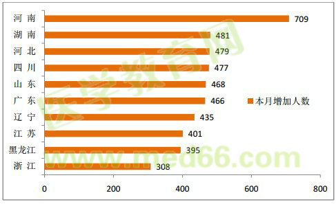 本月注册人数增加前十位的省份:河南、湖南、河北、四川、山东、广东、辽宁、江苏、黑龙江、浙江(见附表 1,图 1)。