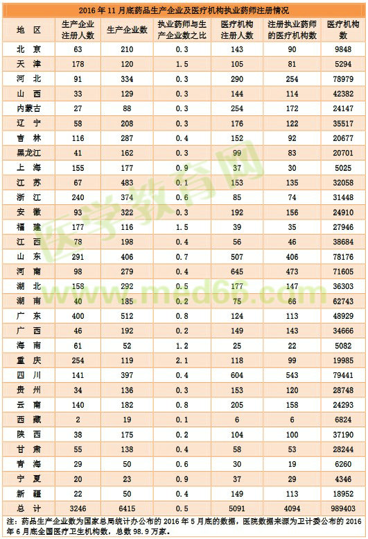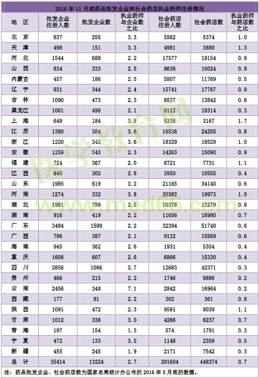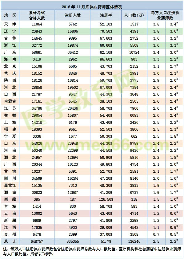 2016年12月7日医学教育网根据国家食品药品监督管理总局执业药师资格认证中心发布的“2016年11月全国执业药师注册情况”搜集整理了相关信息,供广大考生参考。内容如下: