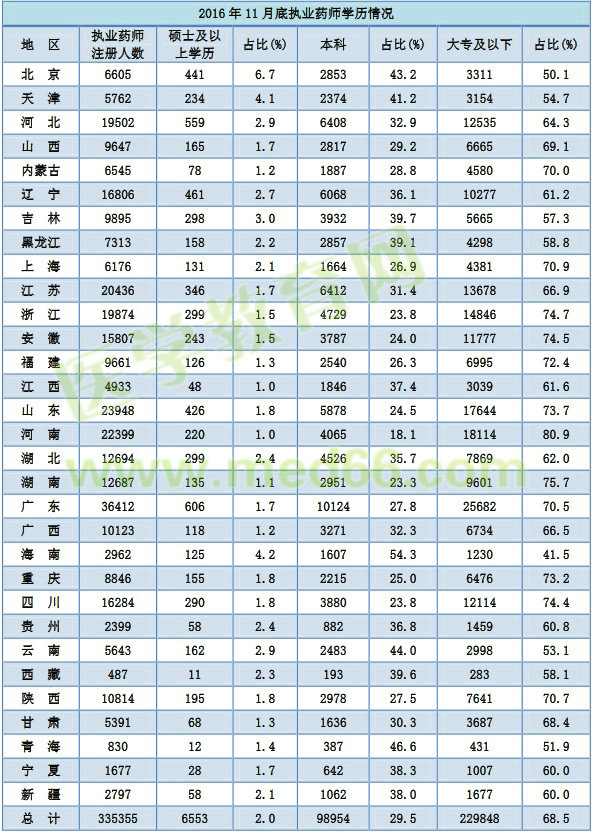 截至2016年11月30日,执业药师学历分布情况:研究生6553人,本科98954人,大专119948人,中专109900人;本科及以上学历占比31.5%(见表1、附表4)。