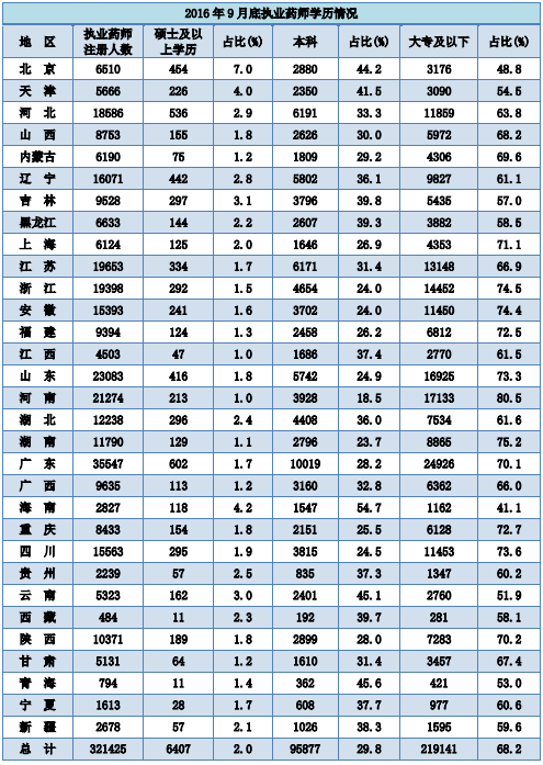 截至2016年9月30日,执业药师学历分布情况:研究生6407人,本科95877人,大专114278人,中专104863人;本科及以上学历占比31.8%。