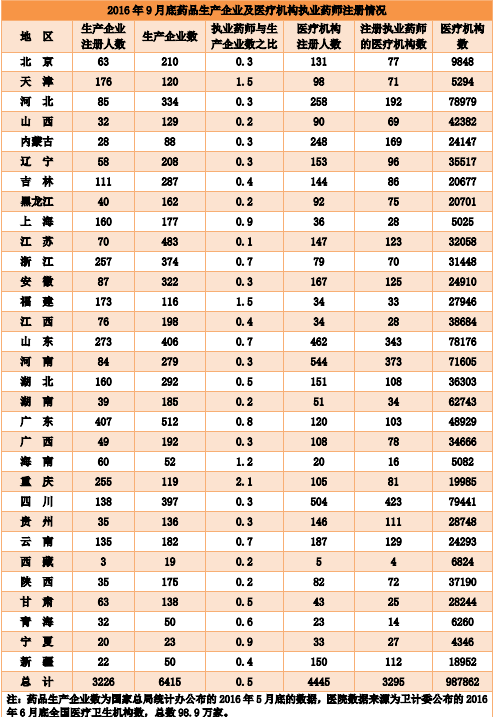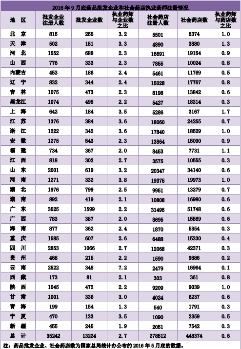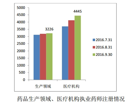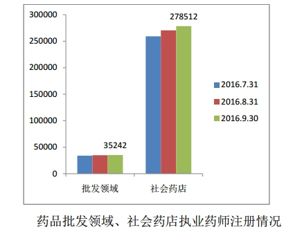 截至2016年9月30日,注册于药品生产企业、药品批发企业、社会药店及医疗机构的执业药师人数全面增长,分别为3226人、35242人、278512人、4445人。