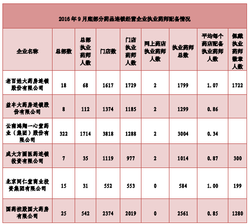 药品生产企业、医疗机构中执业药师积极注册于本职单位,药品批发企业和社会药店中执业药师注册显著增加。部分药品连锁经营企业执业药师配备情况见下图。