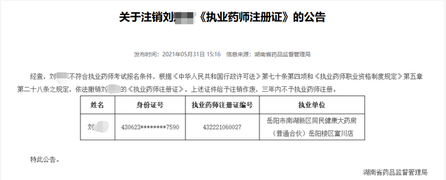 5月31日,湖南省药监局通报,经查,刘某某不符合执业药师考试报名条件,根据有关规定,依法撤销刘某某的《执业药师注册证》,上述证件给予注销作废,三年内不予执业药师注册。