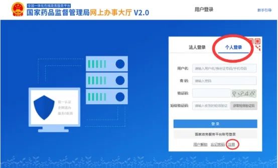 1.登录“云南省药品监督管理局”(http://mpa.yn.gov.cn/),单击“执业药师注册平台”,进入“国家药品监督管理局网上办事大厅”个人登录页面(https://zwfw.nmpa.gov.cn/web/user/login#person)。或直接登录”国家药品监督管理局网上办事大厅”首页(https://zwfw.nmpa.gov.cn),单击“个人登录”。(注意:“在国家药品监督管理局网上办事大厅“未注册用户请按要求进行“注册”,已注册用户直接登录。)
