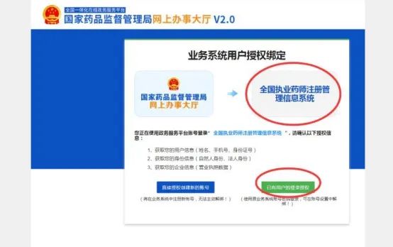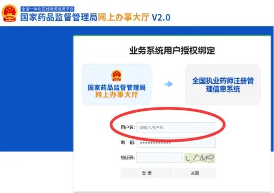 3.首次办理执业药师注册用户,进行业务系统用户授权绑定,选择“已有用户的登录授权”。“用户名”输入国家药品监督管理局执业药师注册平台中证件号码(执业药师身份证件号码),密码默认,输入验证码,登录。验证成功即账号绑定了“全国执业药师注册管理信息系统”,下次选择“全国执业药师注册管理信息系统在线办理”即可直接进入执业药师注册页面,选择注册省份和注册办理模式进行个人注册申报。
