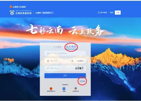 2.登录单位法人用户账号和密码(注意:2019年12月1日前注册的用户输入用户名和密码从右侧窗口登录,2019年12月1日后注册的用户从左侧云南政务服务登录入口进入,在“云南省政务服务网”未注册用户请按要求进行“法人注册”,已注册用户直接登录)。