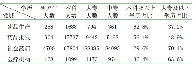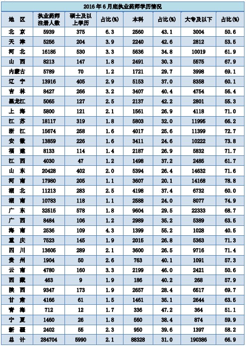 截至2016年6月30日,执业药师学历分布情况:研究生5990人,本科88328人,大专99794人,中专90592人;本科及以上学历占比33.1%.