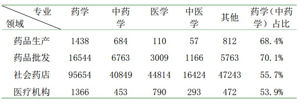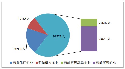 医院40873人、其他医疗机构(疾病预防控制中心、卫生站、保健院、计生服务站、门诊部、血站等)54964人、药品生产企业26930人、药品批发企业12564人、药品零售企业97221人、药品检验71人,高校、学院、研究所1485人,器械公司378任,及药品监管、医疗保险中心、人才服务中心等497人。