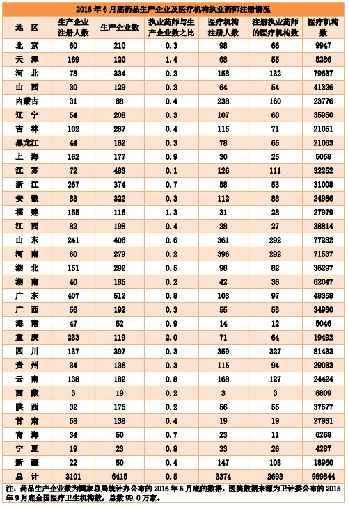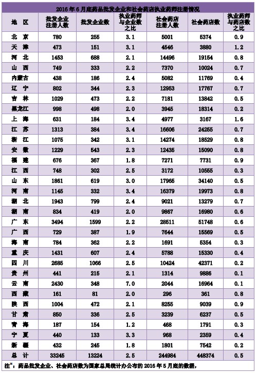 截至2016年6月30日,注册于药品生产企业、药品批发企业、社会药店及医疗机构的执业药师人数分别为3101人、33245人、244984人、3374人。
