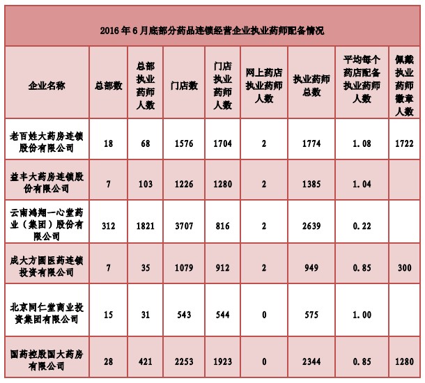 药品生产企业、药品批发企业、社会药店及医疗机构中注册的执业药师逐步增加,部分药品连锁经营企业执业药师配备情况。