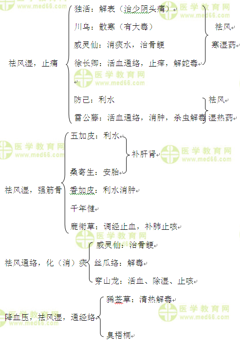 代表药记忆小口诀:风湿川乌独威灵,二瓜防己豨梧桐,鹿衔香皮伸筋草,雷络桑枝二风藤,千年秦艽寄长卿。(另加路路通、穿山龙)[医学教育网原创]