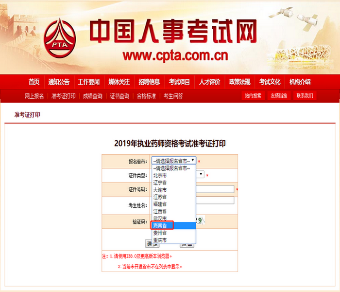 2019年执业药师考试马上就要到了,中国人事考试网显示海南省的准考证打印入口已经开通了,内容如下: