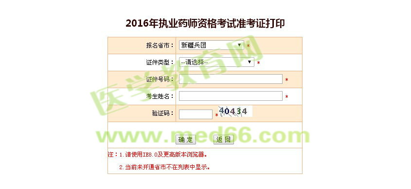 新疆兵团2016年执业药师考试准考证打印入口已经公布,为帮助广大考生及时打印准考证,医学教育网及时更新了相关信息,请点击下面链接或者图片进入2016年执业药师考试准考证打印入口,填写个人姓名及证件号码打印2016年考试准考证。