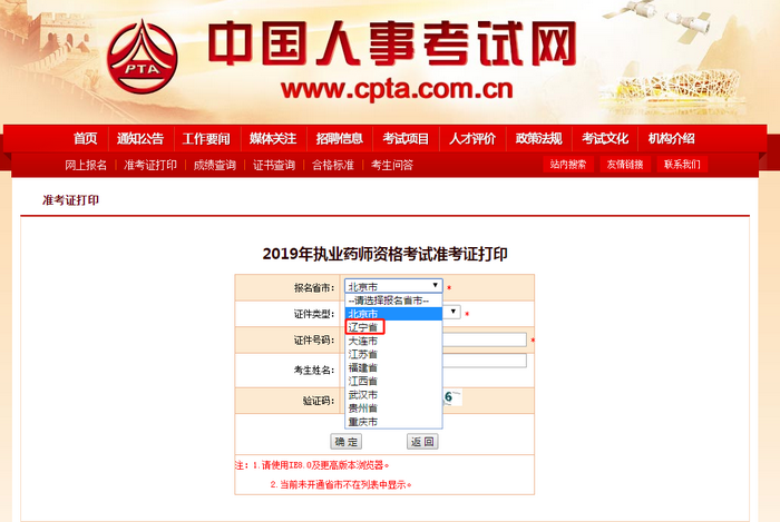 2019年执业药师考试即将开始,中国人事考试网显示辽宁省的准考证打印入口已经开通了,内容如下: