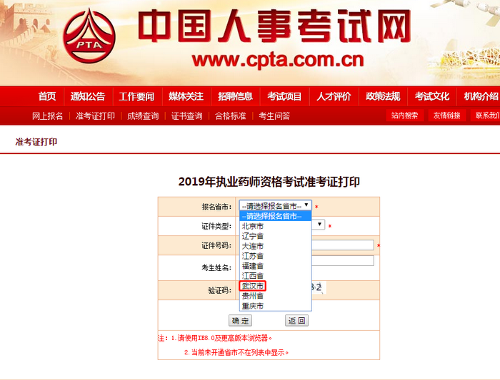 2019年执业药师考试即将开始,中国人事考试网显示武汉市的准考证打印入口已经开通了,内容如下:
