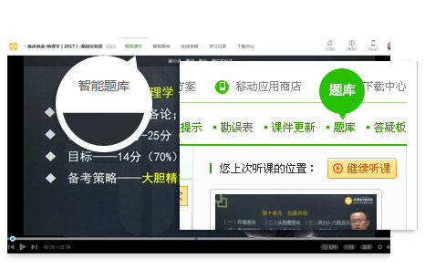 网校在“我的网校我的家”右上方设有“题库”入口,并且听课界面上方也设有“智能题库”的入口,让考生能够进行课后练习和巩固,加深理解。