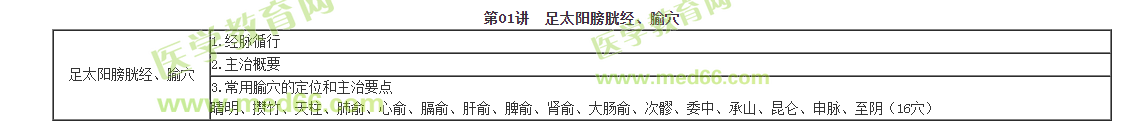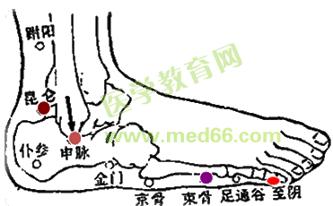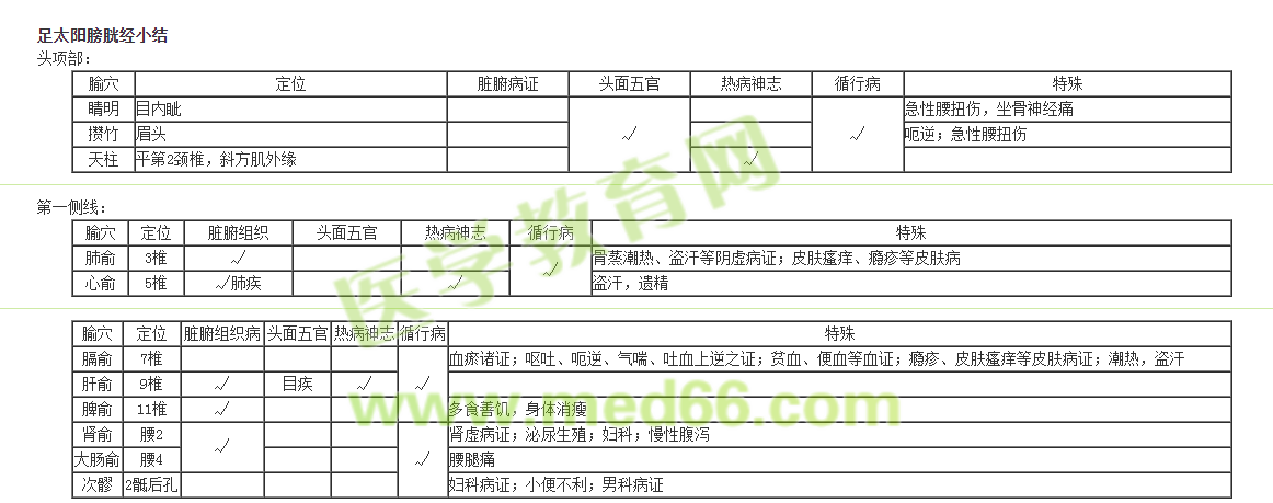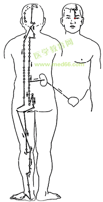 有穴通路:起目内眦――头项――腰背第一(督脉旁1.5寸)、二(督脉旁3寸)侧线――下肢外侧后缘――小趾(睛明--至阴)