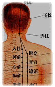 【定位】在颈后区,横平第2颈椎棘突上际,斜方肌外缘凹陷中。