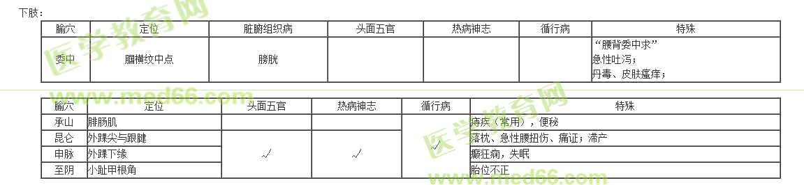 【主治】①月经不调、痛经、带下等妇科病证;②小便不利;③遗精、疝气等男科病证;④腰骶痛,下肢痿痹。