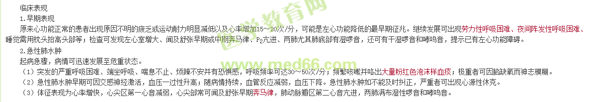 2.常见的临床表现是急性左心衰竭所致的呼吸困难,系由肺淤血所致,严重患者可出现急性肺水肿和心源性休克。