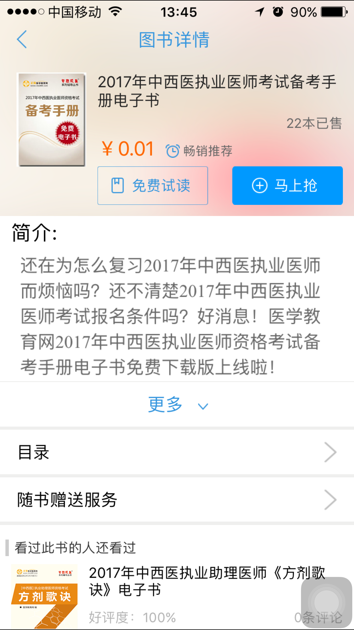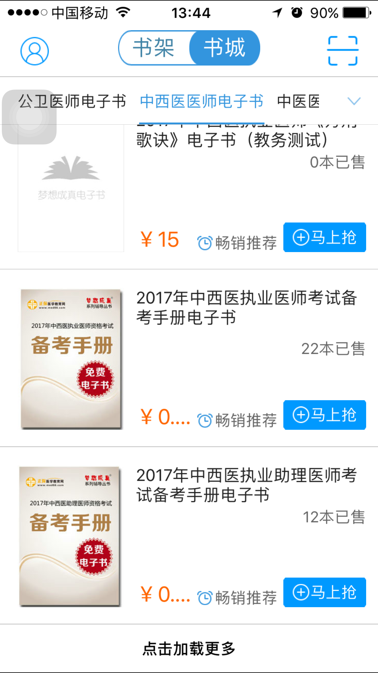第二步:下载完成后,在手机上打开“梦想成真-医学考试电子书”客户端;点击“书城”→中西医医师电子书,找到“2017年中西医执业医师考试备考手册电子书”(如图):