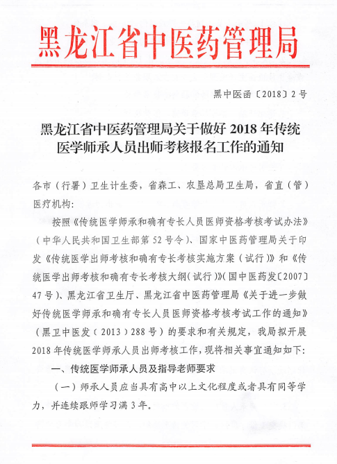 黑龙江省中医药管理局2018年传统医学师承人员出师考核报名工作的通知现已公布,为此,医学教育网为大家搜集整理如下内容,供大家参考,希望对大家有所帮助。