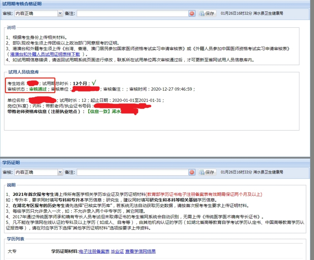 湖北考区网上审核新变化:一是考生身份核验,以国网公安库核对信息为准;二是试用期信息,试用期考核证明申报前期已在湖北卫生人才综合服务平台进行,审核工作将在省网报名系统内完成。(查看原文通知>>)
